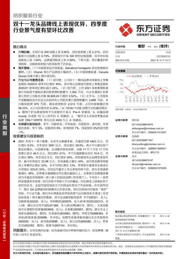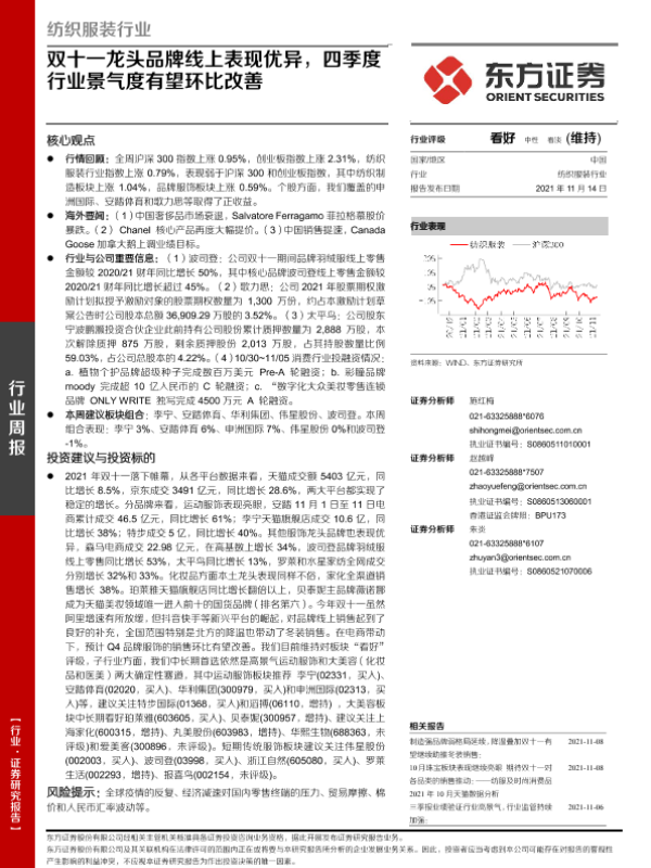 【东方证券】【20211114】纺织服装行业:双十一龙头品牌线上表现优异,四季度行业景气度有望环比改善-10页