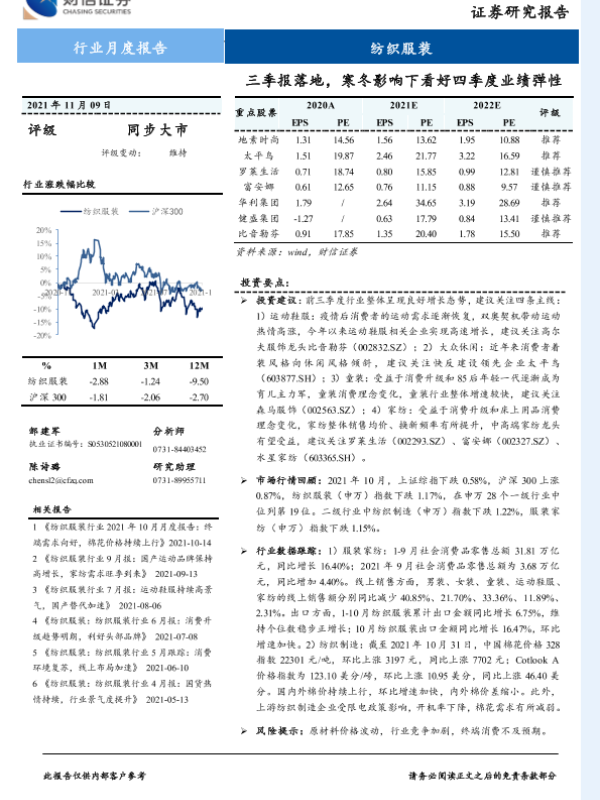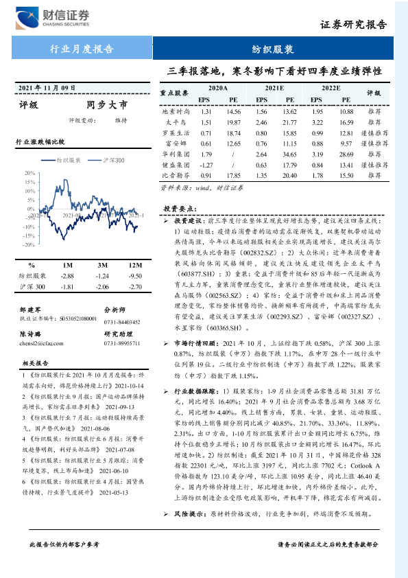 【财信证券】【20211109】20211109-财信证券-纺织服装行业月度报告:三季报落地,寒冬影响下看好四季度业绩弹性-15页