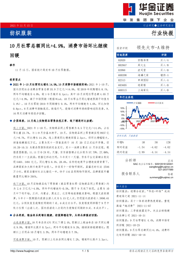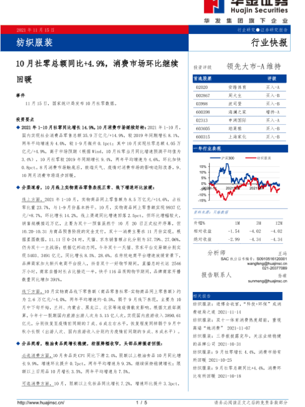 【华金证券】【20211115】20211115-华金证券-纺织服装:10月社零总额同比+4.9%,消费市场环比继续回暖-5页