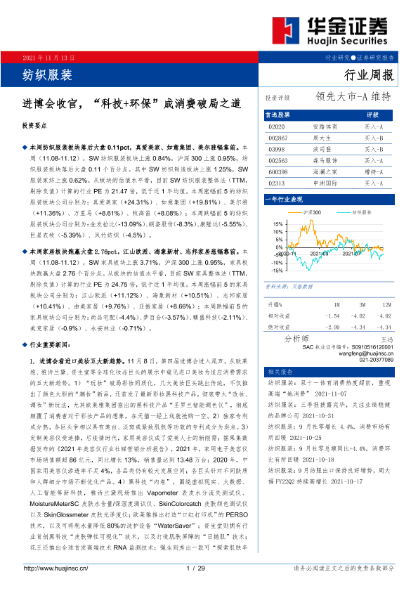 【华金证券】【20211113】纺织服装行业周报:进博会收官,“科技+环保”成消费破局之道-29页