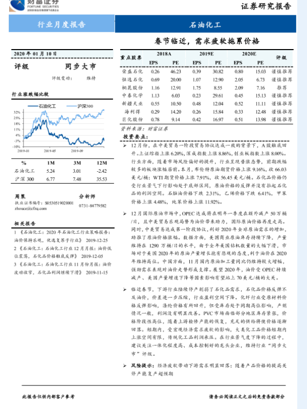 【财信证券】【20200110】20200110-财信证券-石油化工行业月度报告:春节临近,需求疲软拖累价格-11页