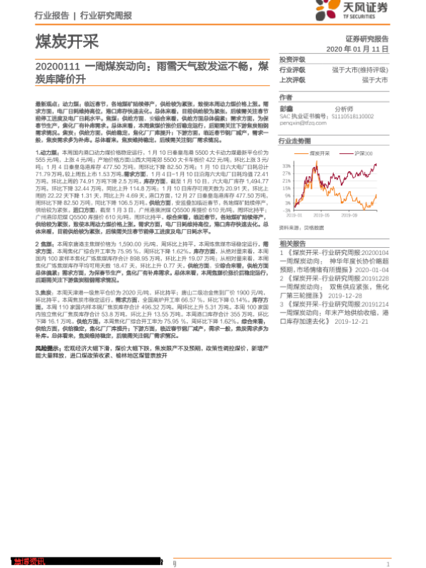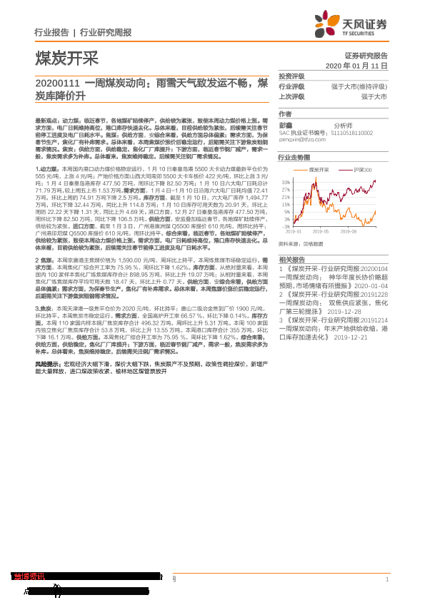 【天风证券】【20200111】20200111-天风证券-一周煤炭动向:雨雪天气致发运不畅,煤炭库降价升-19页