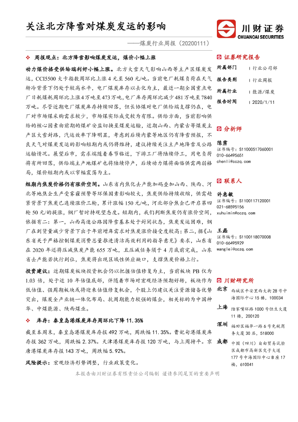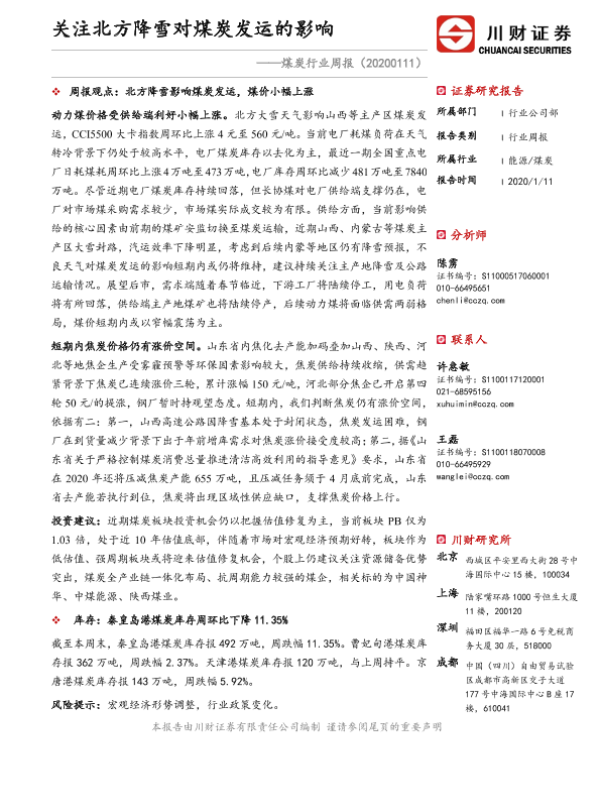 【川财证券】【20200111】煤炭行业周报:关注北方降雪对煤炭发运的影响-16页