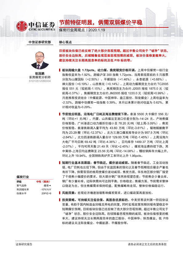 【中信证券】【20200119】20200119-中信证券-煤炭行业周观点:节前特征明显,供需双弱煤价平稳-7页