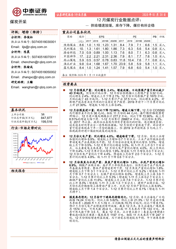 【中泰证券】【20200120】12月煤炭行业数据点评:供给增速放缓,库存下降,煤价有所企稳-6页