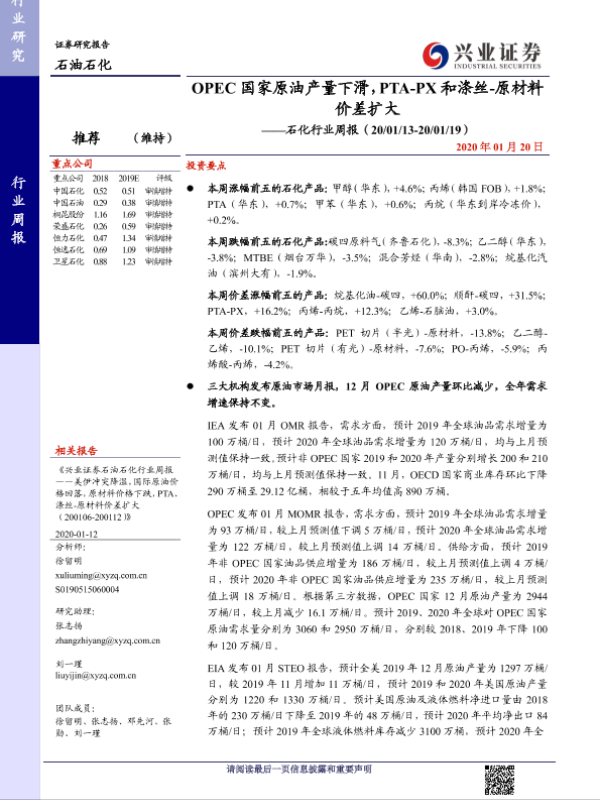 【兴业证券】【20200120】20200120-兴业证券-石化行业周报:OPEC国家原油产量下滑,PTA-PX和涤丝-原材料价差扩大-13页