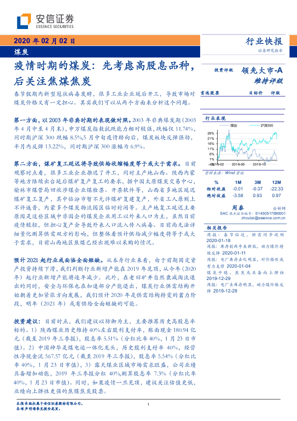 【安信证券】【20200202】疫情时期的煤炭:先考虑高股息品种,后关注焦煤焦炭-4页