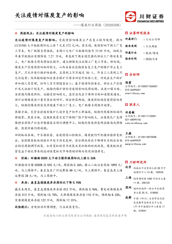 【川财证券】【20200208】煤炭行业周报:关注疫情对煤炭复产的影响-15页