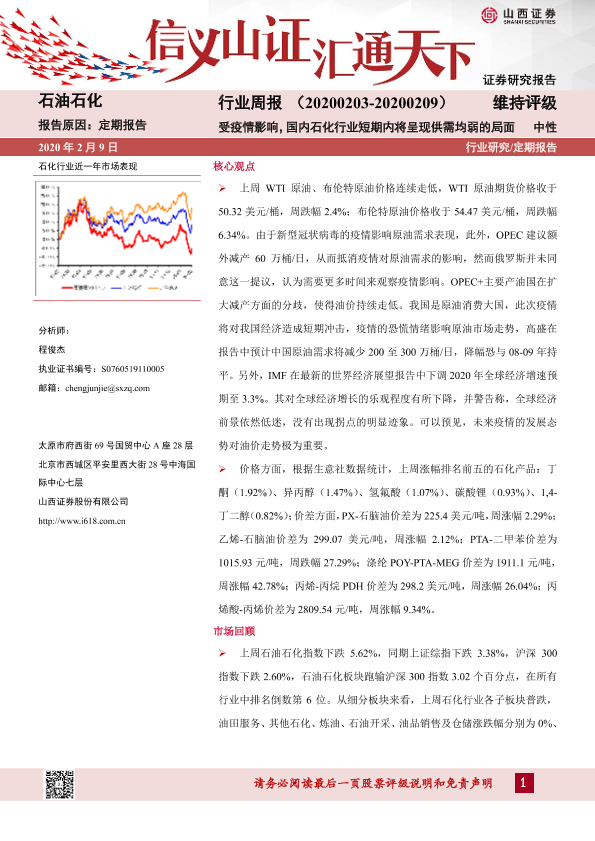 【山西证券】【20200209】20200209-山西证券-石油石化行业周报:受疫情影响,国内石化行业短期内将呈现供需均弱的局面-12页