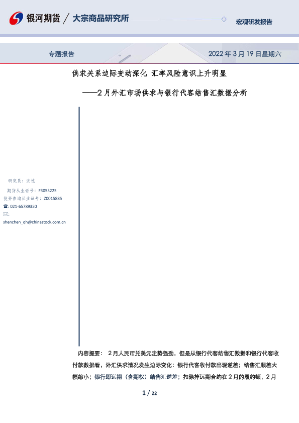 【银河期货】【20220319】2月外汇市场供求与银行代客结售汇数据分析:供求关系边际变动深化,汇率风险意识上升明显-22页
