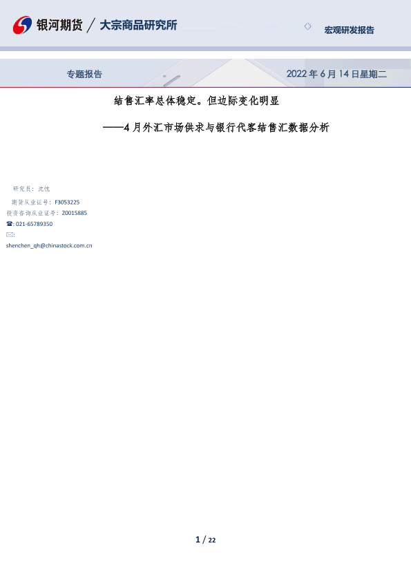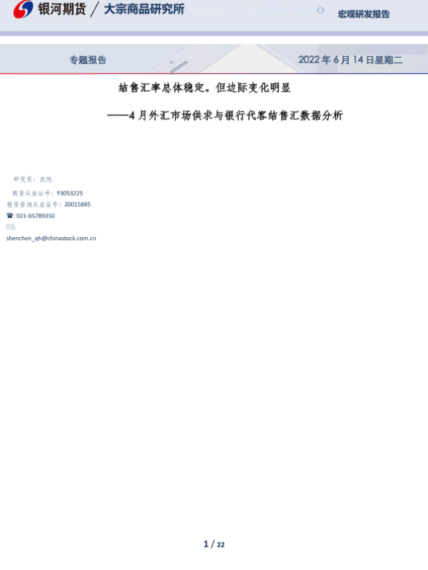 【银河期货】【20220614】4月外汇市场供求与银行代客结售汇数据分析:结售汇率总体稳定。但边际变化明显-22页