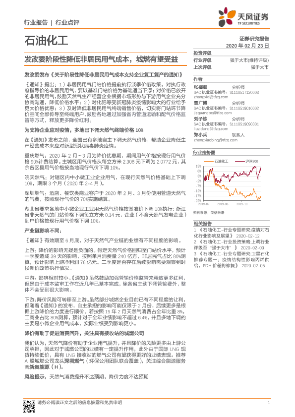 【天风证券】【20200223】石油化工行业点评:发改委阶段性降低非居民用气成本,城燃有望受益-2页