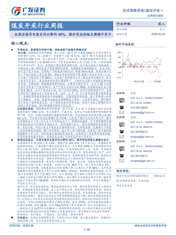 【广发证券】【20200223】20200223-广发证券-煤炭开采行业周报:本周沿海用电需求同比降约40%,煤价受低供给支撑稳中有升-22页