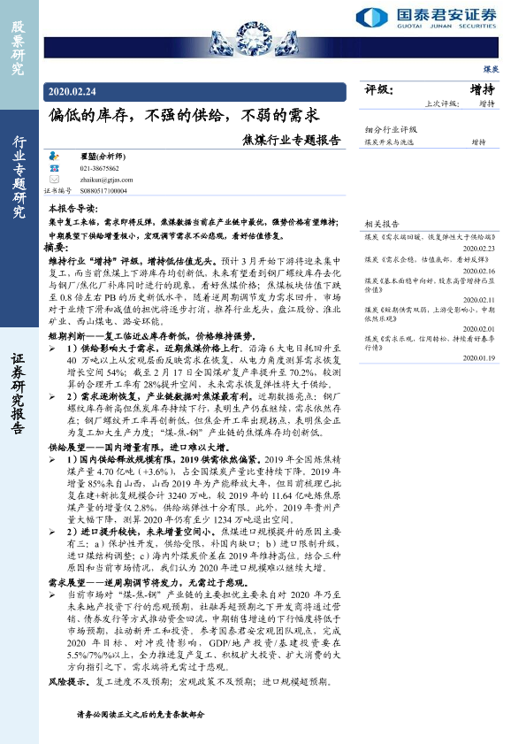 【国泰君安证券】【20200224】20200224-国泰君安-焦煤行业专题报告:偏低的库存,不强的供给,不弱的需求-16页