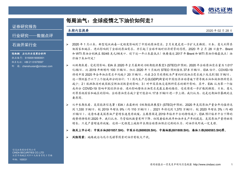 【信达证券】【20200228】每周油气:全球疫情之下油价如何走?-5页
