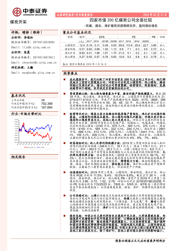 【中泰证券】【20200227】20200227-中泰证券-煤炭开采行业深度报告:四家市值200亿煤炭公司全面比较:西煤、潞安、淮矿煤炭资源禀赋优异,盈利强估值低-25页