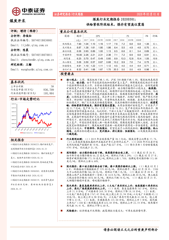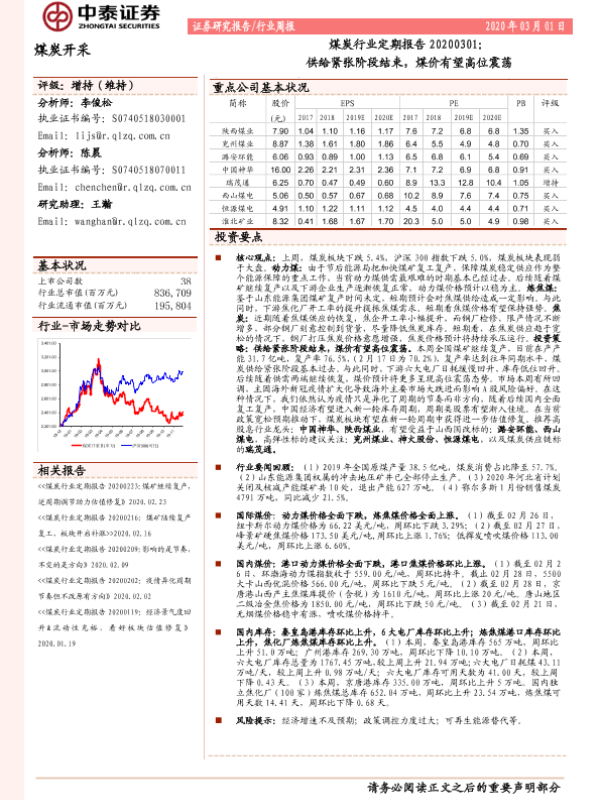 【中泰证券】【20200301】20200301-中泰证券-煤炭行业定期报告:供给紧张阶段结束,煤价有望高位震荡-15页