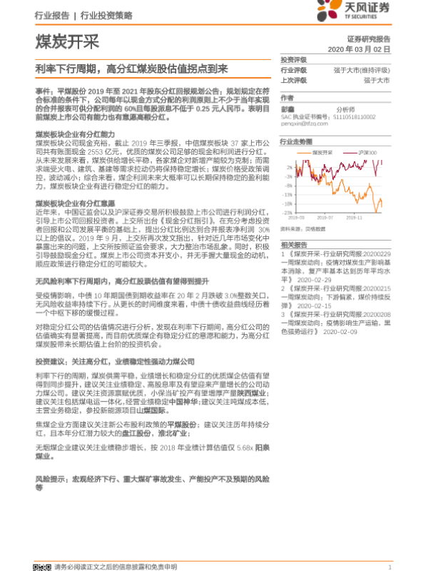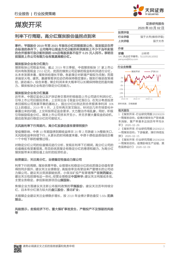 【天风证券】【20200302】20200302-天风证券-煤炭开采行业投资策略:利率下行周期,高分红煤炭股估值拐点到来-14页