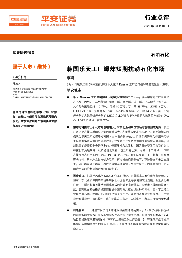 【平安证券】【20200304】石油石化行业点评:韩国乐天工厂爆炸短期扰动石化市场-2页
