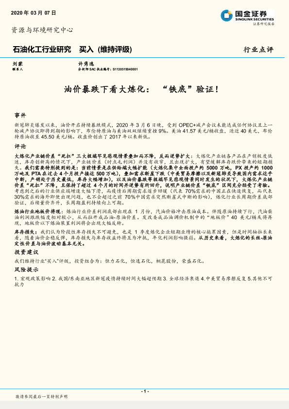 【国金证券】【20200307】20200307-国金证券-石油化工行业研究:油价暴跌下看大炼化:“铁底”验证!-10页