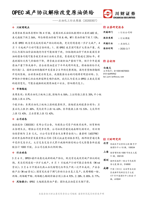 【川财证券】【20200307】石油化工行业周报:OPEC减产协议解除改变原油供给-12页
