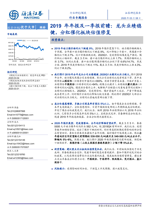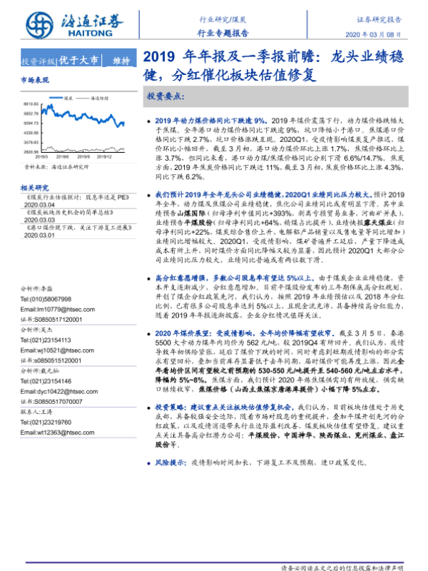 【海通证券】【20200308】煤炭2019年年报及一季报前瞻:龙头业绩稳健,分红催化板块估值修复-17页