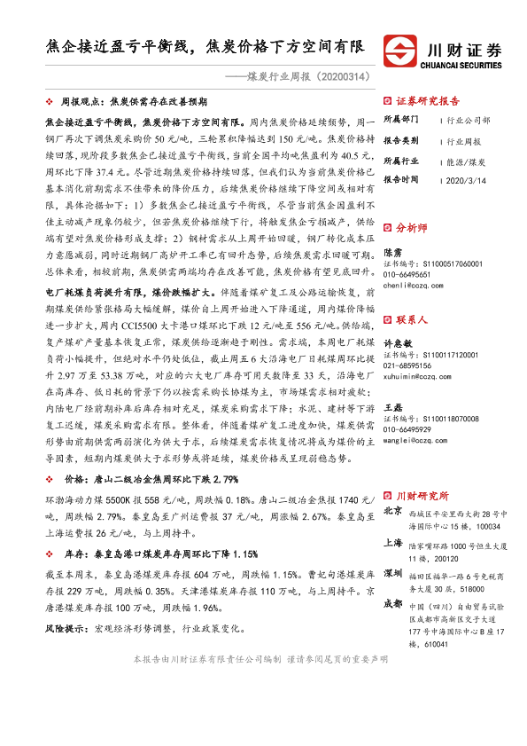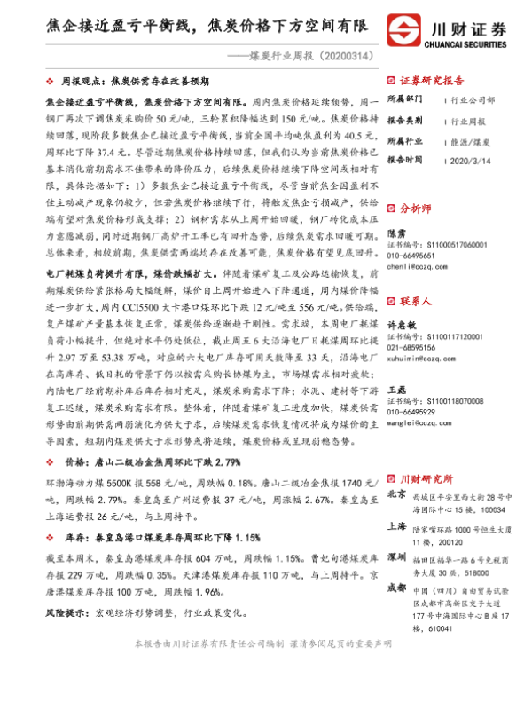 【川财证券】【20200314】20200314-川财证券-煤炭行业周报:焦企接近盈亏平衡线,焦炭价格下方空间有限-13页