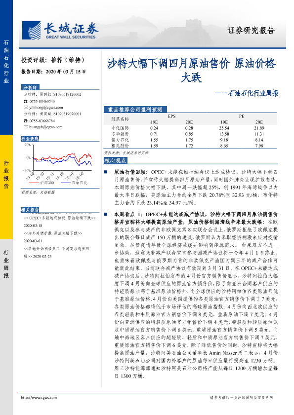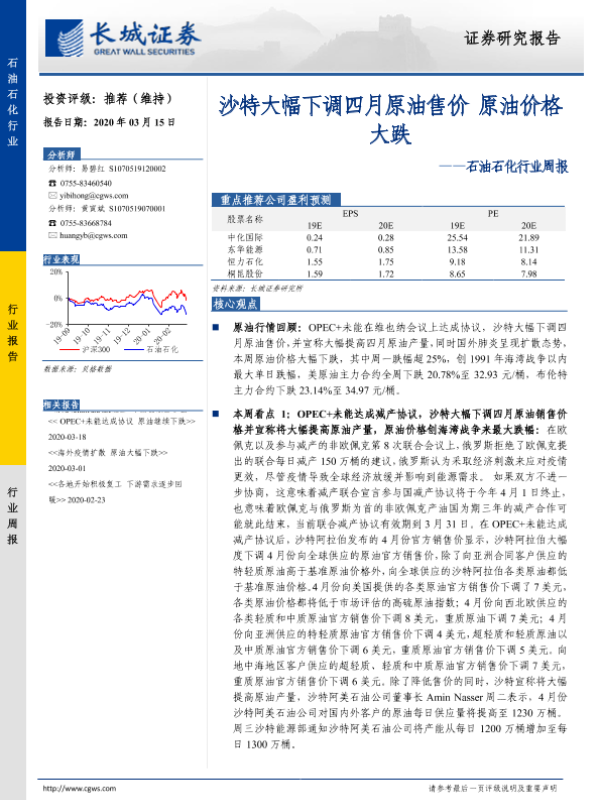 【长城证券】【20200315】石油石化行业周报:沙特大幅下调四月原油售价 原油价格大跌-10页