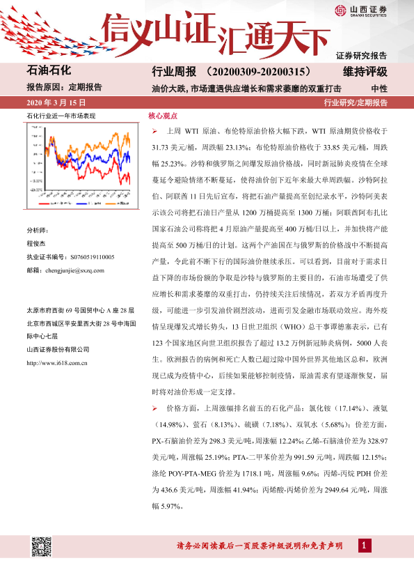【山西证券】【20200315】20200315-山西证券-石油石化行业周报:油价大跌,市场遭遇供应增长和需求萎靡的双重打击-13页