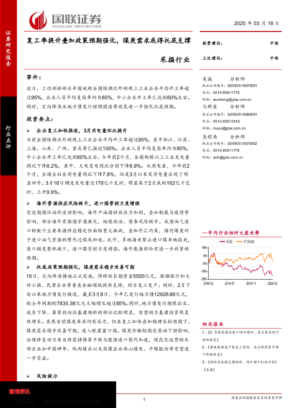 【国联证券】【20200318】采掘行业:复工率提升叠加政策预期强化,煤炭需求或得托底支撑-3页