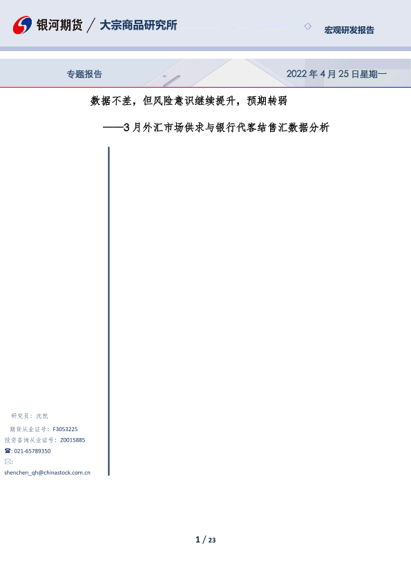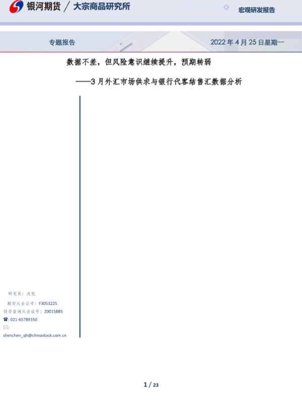 【银河期货】【20220425】3月外汇市场供求与银行代客结售汇数据分析,数据不差,但风险意识继续提升,预期转弱-23页