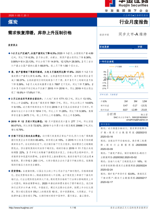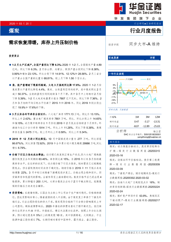 【华金证券】【20200320】20200320-华金证券-煤炭行业月度报告:需求恢复滞缓,库存上升压制价格-16页