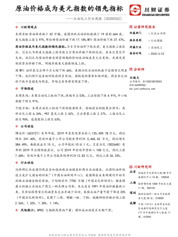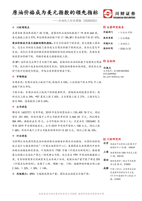 【川财证券】【20200322】石油化工行业周报:原油价格成为美元指数的领先指标-13页