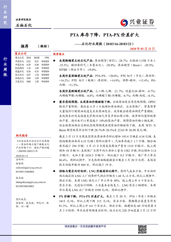 【兴业证券】【20200322】20200322-兴业证券-石化行业周报:PTA库存下降,PTA-PX价差扩大-12页