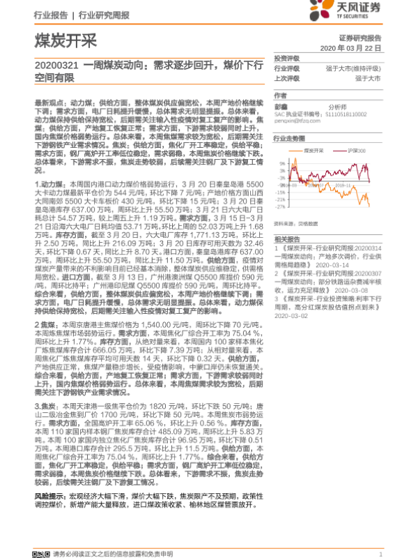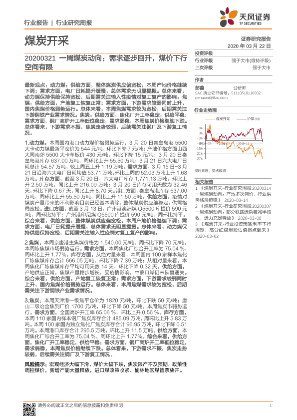 【天风证券】【20200322】20200322-天风证券-一周煤炭动向:需求逐步回升,煤价下行空间有限-19页