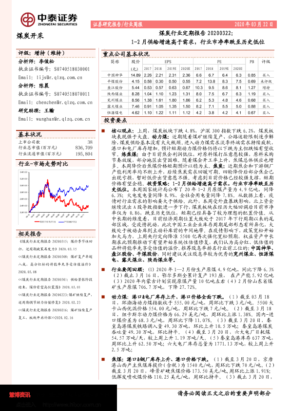 【中泰证券】【20200322】煤炭行业定期报告:1-2月供给增速高于需求,行业市净率跌至历史低位-20页