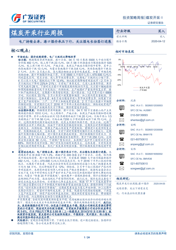 【广发证券】【20200412】20200412-广发证券-煤炭开采行业周报:电厂持续去库,港口煤价承压下行,关注煤电长协签订进展-24页