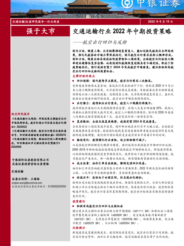 交通运输 市场分析 投资策略 疫情恢复 航空出行