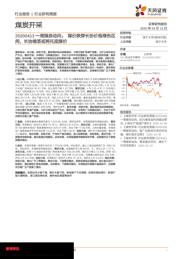 【天风证券】【20200413】20200413-天风证券-煤炭开采:一周煤炭动向:煤价跌穿长协价格绿色区间,长协续签或将托底煤价-19页