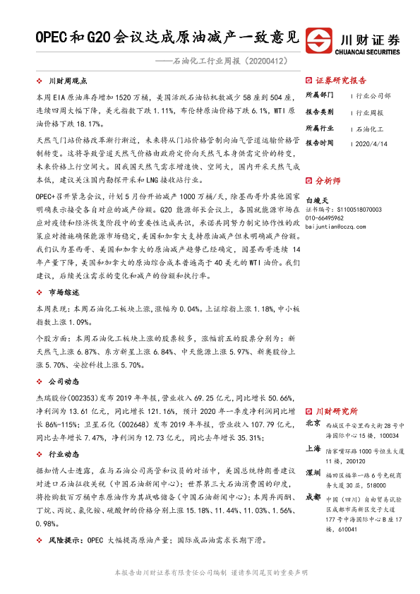 【川财证券】【20200414】20200414-川财证券-石油化工行业周报:OPEC和G20会议达成原油减产一致意见-12页