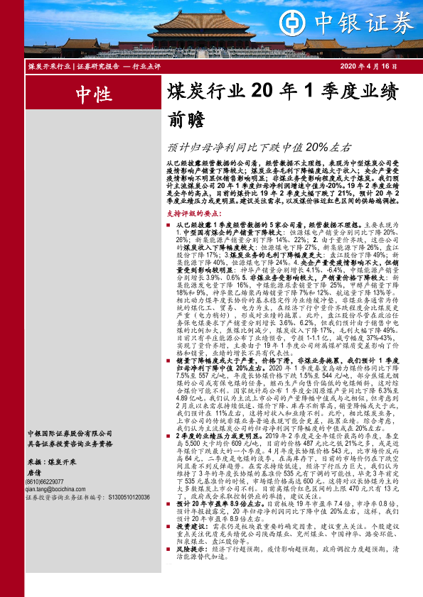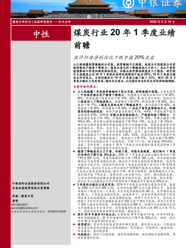 【中银证券】【20200416】煤炭行业20年1季度业绩前瞻:预计归母净利同比下跌中值20%左右-6页