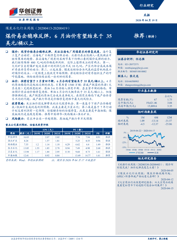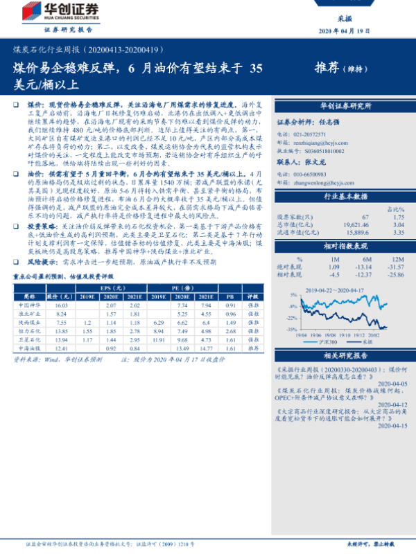 【华创证券】【20200419】20200419-华创证券-煤炭石化行业周报:煤价易企稳难反弹,6月油价有望结束于35美元 桶以上-10页