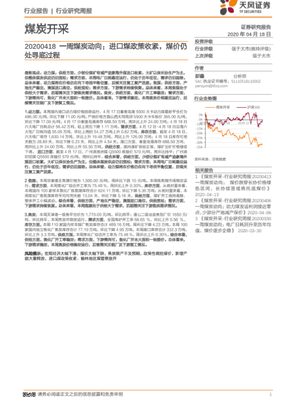 【天风证券】【20200418】20200418-天风证券-一周煤炭动向:进口煤政策收紧,煤价仍处寻底过程-20页