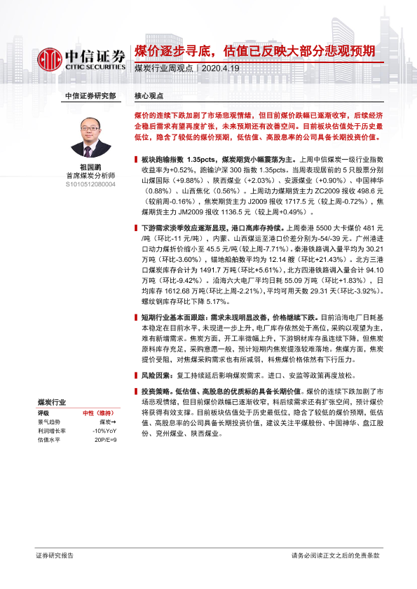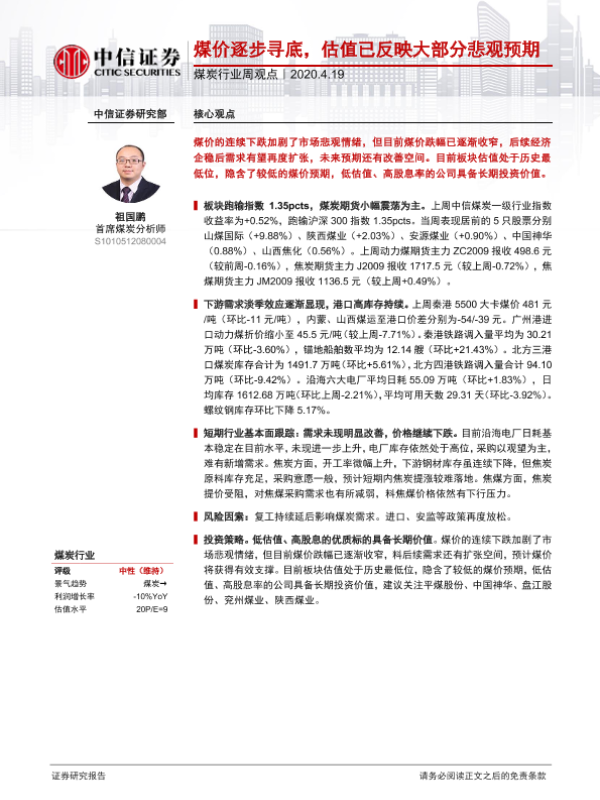 【中信证券】【20200419】20200419-中信证券-煤炭行业周观点:煤价逐步寻底,估值已反映大部分悲观预期-7页