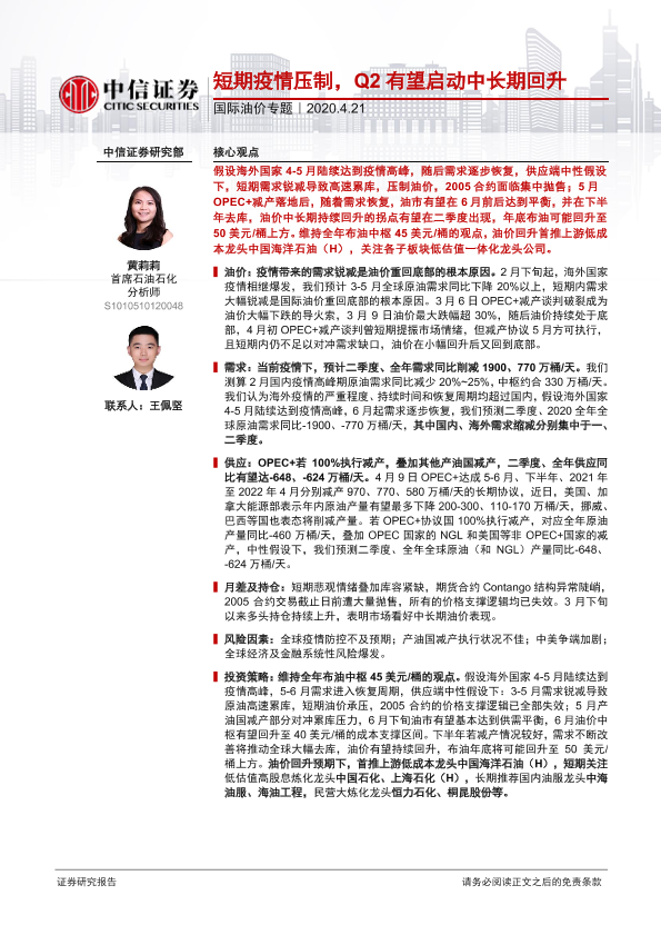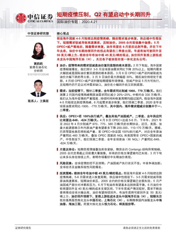 【中信证券】【20200421】石油石化行业国际油价专题:短期疫情压制,Q2有望启动中长期回升-22页