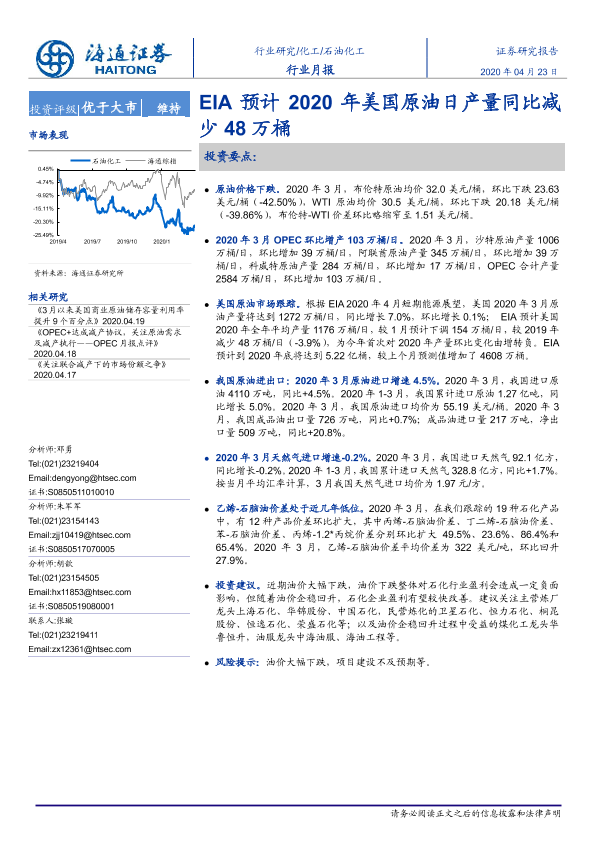 【海通证券】【20200423】20200423-海通证券-石油化工行业月报:EIA预计2020年美国原油日产量同比减少48万桶-8页