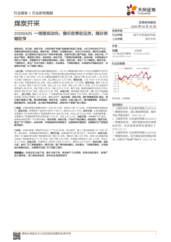 【天风证券】【20200425】20200425-天风证券-一周煤炭动向:稳价政策初见效,煤价跌幅收窄-19页