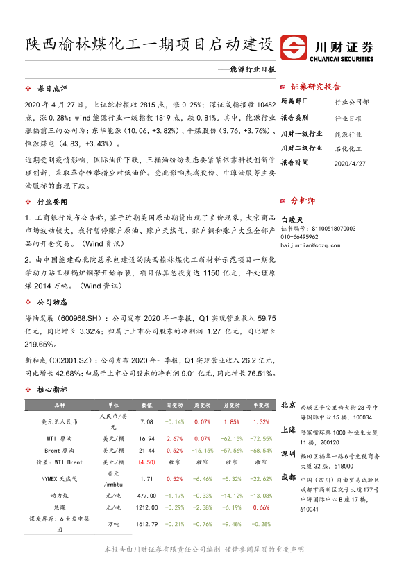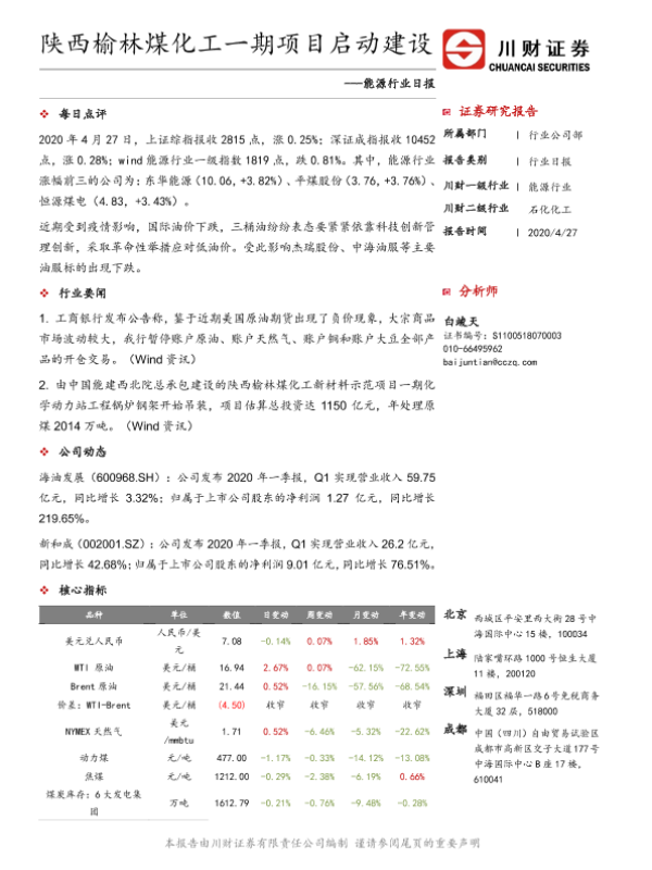【川财证券】【20200427】陕西榆林煤化工一期项目启动建设-3页