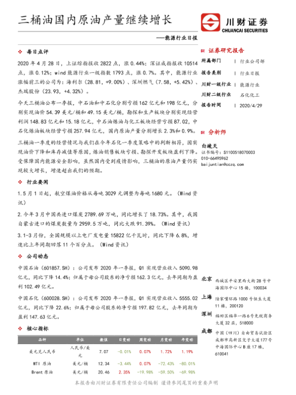 一季度报告 三桶油 亏损 原油产量 能源行业