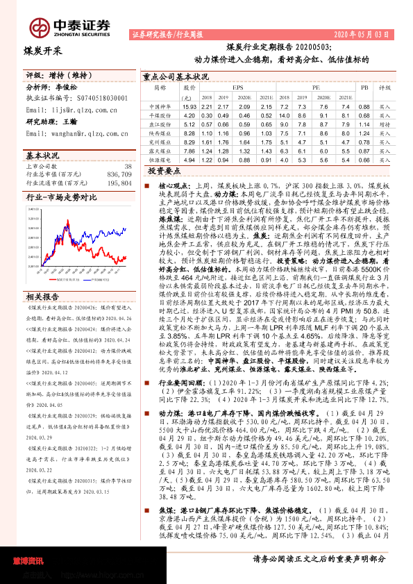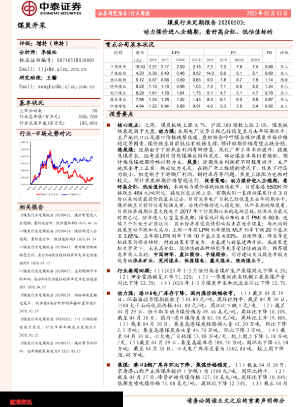 【中泰证券】【20200503】20200503-中泰证券-煤炭行业定期报告:动力煤价进入企稳期,看好高分红、低估值标的-19页